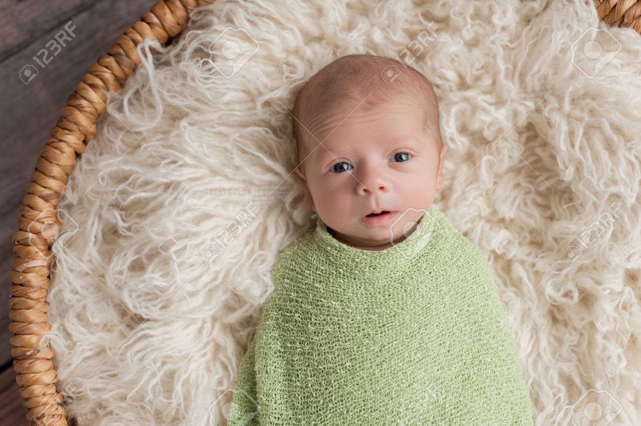 An Alert Four Week Old Newborn Baby Boy With Cute Expression He Is Swaddled In A Light Green Wrap And Lying In A Round Wicker Basket Stock Photo Picture And Royalty Free