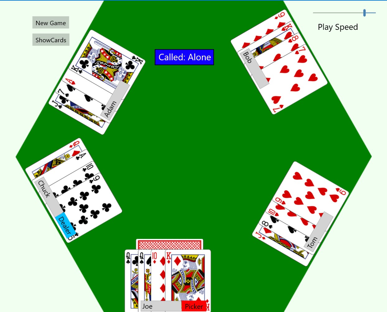 The picker theoretically has more trump than anyone else since they picked on a good hand and was able to use the cards. Fourteen cards are designated as a fixed trump suit. Tricks are created when players play one of their cards into the center.